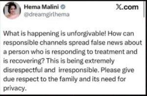 हेमा मालिनी ने भी  एक्स पर अपडेट देते हुए लिखा, जो हो रहा है वो अक्षम्य है! जिम्मेदार चैनल ऐसे झूठी खबरें कैसे फैला सकते हैं। इन सब चीजों का ट्रीटमेंट पर असर पड़ रहा है। यह बेहद अपमानजनक और गैरजिम्मेदाराना है. कृपया परिवार और उनकी निजता का ख्याल करें.’