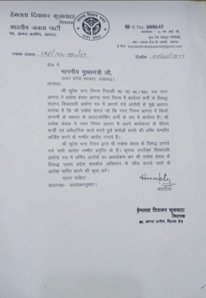 आगरा। मेयर हेमलता दिवाकर कुशवाहा ने राकेश बंसल को अपना ओएसडी नियुक्त किया है। इस बात को लेकर घमासान मचा हुआ है। बताया जा रहा है कि जब वह विधायक थी तो उन्होंने भी शासन में राकेश बंसल की भ्रष्टाचार की शिकायत की थी। यह पत्र भी शुक्रवार को वायरल हो गया है। इधर नगर निगम के बजट सत्र में विपक्षी नेताओं ने जमकर हंगामा किया और मेयर को घेरा।