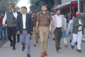 बरसाना में तैयारियों का जायजा लेने पहुंचे मंडलायुक्त नगेंद्र प्रताप और डीआईजी शैलेश पांडे।