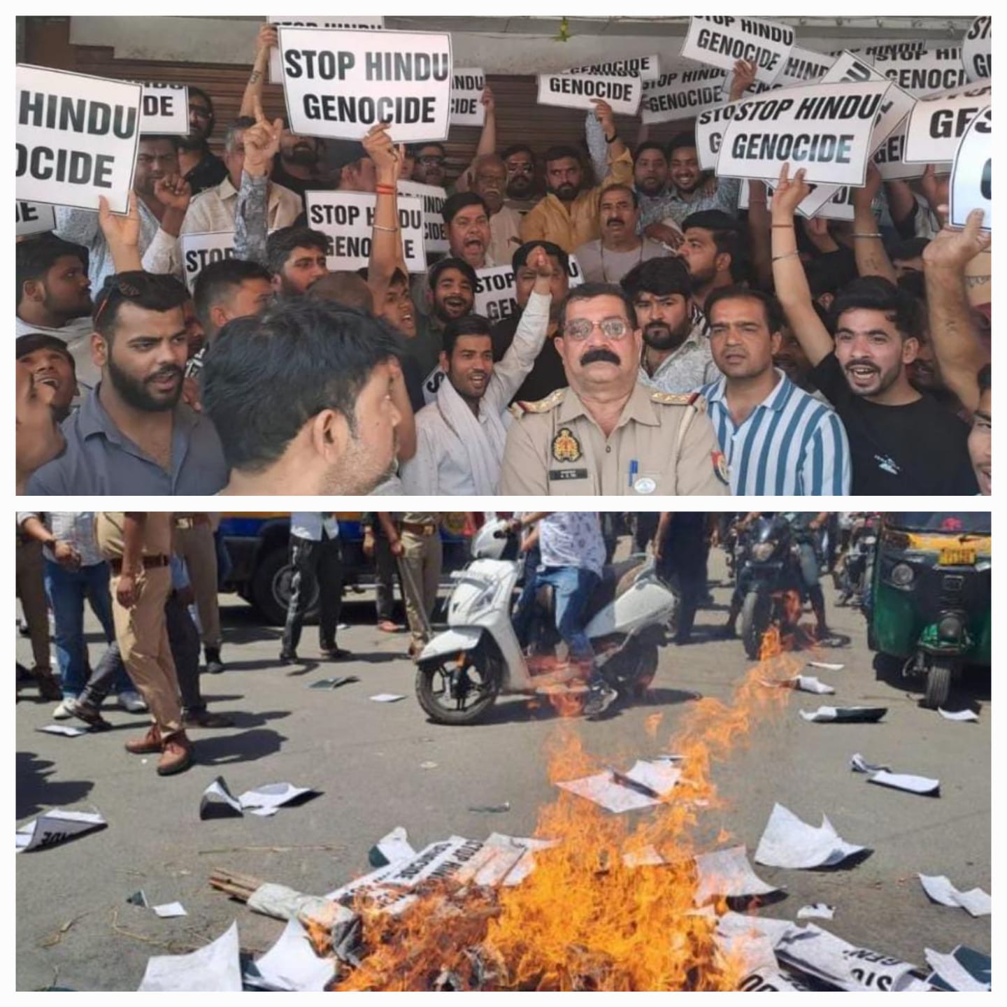 पहलगाम की घटना को लेकर लोगों में भारी आक्रोश है। 26 लोगों की हत्या की गई है। इसके विरोध में बुधवार को व्यापारी सड़क पर उतर आए। पुलिस ने प्रदर्शन कर रहे दुकानदारों को हटाने का प्रयास किया। जब रुई की मंडी चौराहे पर व्यापारियों ने पाकिस्तान का पुतला फूंका और पाक के पोस्टर जलाए तो पुलिस ने दुकानदारों को हटाकर पानी से आग को बुझा दिया। इस दौरान एसीपी लोहामंडी और भाजयुमो नेता गौरव राजावत के बीच गरमा-गरमी भी हुई। पुलिस का तर्क था कि अमेरिका के उप राष्ट्रपति के आगरा में होने के कारण धारा 163 लागू हैं। इधर सेंट जॉन्स चौराहे पर हिंदू महासभा ने भी पुतला दहन किया। अखिल भारत हिंदू महासभा के महानगर अध्यक्ष विशाल कुमार, अखिल भारत हिंदू महासभा के पूर्व राष्ट्रीय प्रवक्ता संजय जाट, शंकर श्रीवास्तव आदि मौजूद रहे।